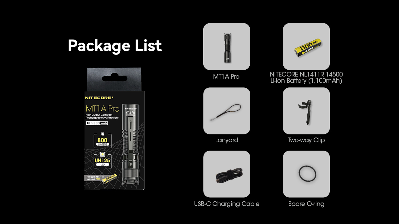 Includes a NITECORE 14500 rechargeable Li-ion battery (NL1411R 1, 100mAh) with a built-in USB-C charging port, offering a runtime up to 10 hours